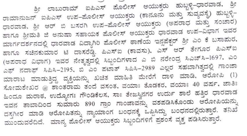 ಬಂಧಿತ ಆರೋಪಿಯಿಂದ 890 ಗ್ರಾಂ ಗಾಂಜಾವನ್ನ ವಶಕ್ಕೆ ಪಡೆಯಲಾಗಿದೆ. ಅಂದಾಜು 40 ವಯಸ್ಸಿನ ಸೋಮಶೇಖರ, ನಿರಂತರವಾಗಿ ಈ ದಂಧೆಯಲ್ಲಿ ತೊಡಗಿದ್ದನೆಂದು ಮಾಹಿತಿಯಿತ್ತಾದರೂ, ಆರೋಪಿ ಸಿಕ್ಕಿಬಿದ್ದಿರಲಿಲ್ಲ.