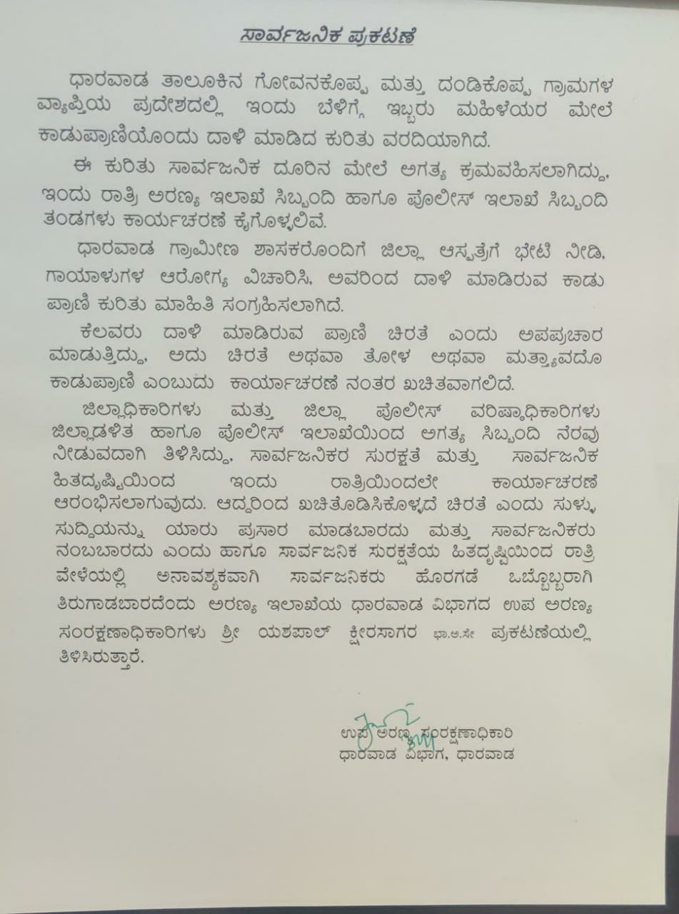 ಕಾಡು ಪ್ರಾಣಿಯು ದಾಳಿ ಮಾಡಿದ್ದು, ಮಹಿಳೆಯರಿಗೆ ಗಾಯಗಳಾಗಿವೆ. ಅದು ಚಿರತೆ ಅಥವಾ ತೋಳವೋ ಅಥವಾ ಮತ್ಯಾವುದೋ ಪ್ರಾಣಿ ಎಂಬುದು ಕಾರ್ಯಾಚರಣೆಯ ನಂತರ ತಿಳಿದು ಬರುತ್ತದೆಯೋ ಹೊರತಾಗಿ ಮೊದಲೇ ಅಲ್ಲ ಎಂದು ಅಧಿಕಾರಿಗಳು ಹೇಳಿದ್ದಾರೆ.