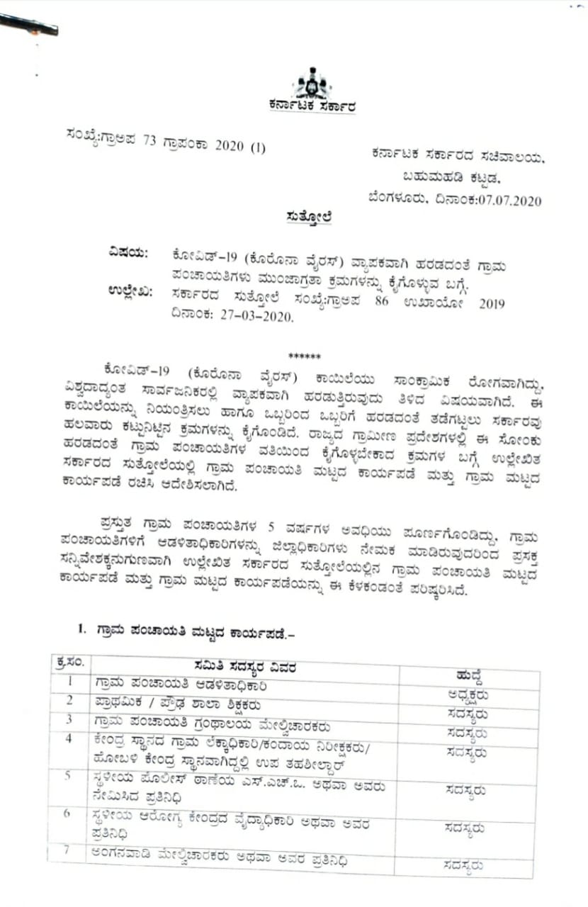 ಕೋವಿಡ್-19 ವ್ಯಾಪಕವಾಗಿ ಹರಡುತ್ತಿರುವ ಹಿನ್ನೆಲೆಯಲ್ಲಿ ಗ್ರಾಮ ಪಂಚಾಯತಿಗಳು ಮುಂಜಾಗ್ರತಾ ಕ್ರಮಗಳನ್ನ ತೆಗೆದುಕೊಳ್ಳಬೇಕಾಗಿದ್ದು, ಅದಕ್ಕಾಗಿ ಯಾರು ಏನು ಆಗಿರುತ್ತಾರೆ ಎಂಬ ಮಾಹಿತಿಯ ಆದೇಶವನ್ನ ಹೊರ ಹಾಕಿದೆ.