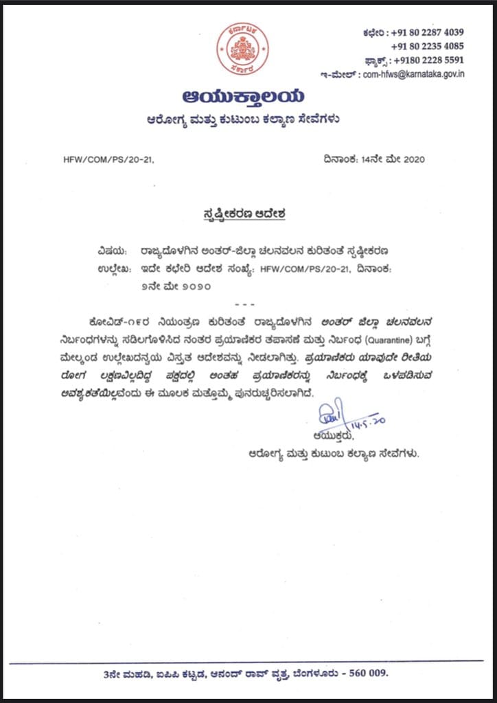 ಅಂತರ್ ಜಿಲ್ಲೆಗಳಲ್ಲಿ ಸಂಚಾರ ಮಾಡುವವರಿಗೂ ಕೆಲವೆಡೆ ತೊಂದರೆಯಾಗುತ್ತಿರುವ ಬಗ್ಗೆ ಹಲವು ದೂರುಗಳು ಬಂದಿದ್ದವು. ಈ ಹಿನ್ನೆಲೆಯಲ್ಲಿ ಹೊಸ ಆದೇಶವನ್ನ ಹೊರಡಿಸಿದೆ. ಹೀಗಾಗಿ ಅಂತರ್ ಜಿಲ್ಲಾ ಸಂಚಾರಿಗಳಿಗೆ ತೊಂದರೆ ಕೊಡಬಾರದೆಂದು ಹೇಳಲಾಗಿದೆ.