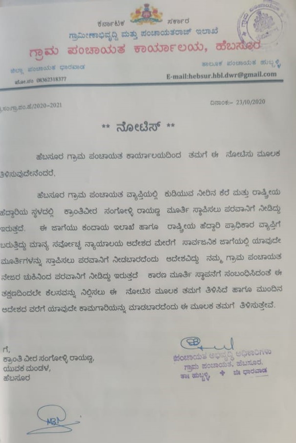 ಇದಾದ ನಂತರ ಅಕ್ಟೋಬರ್ 23- 2020ರಲ್ಲಿ ಅದೇ ಹೆಬಸೂರಿನ ಗ್ರಾಮ ಪಂಚಾಯತಿಯು ಕ್ರಾಂತಿವೀರ ಸಂಗೋಳ್ಳಿ ರಾಯಣ್ಣ ಯುವಕ ಮಂಡಳಕ್ಕೆ ನೋಟಿಸ್ ನ್ನ ನೀಡಿತ್ತು. ಅದರಲ್ಲಿ ಸ್ಪಷ್ಟವಾಗಿ ವಿವರವನ್ನ ನೀಡಲಾಗಿತ್ತು. ನೋಟಿಸ್ ಪ್ರಕಾರ, ‘ಮೂರ್ತಿ ಸ್ಥಾಪನೆಗೆ ನೀಡಿರುವ ಜಾಗವೂ ಕಂದಾಯ ಇಲಾಖೆ ಹಾಗೂ ರಾಷ್ಟ್ರೀಯ ಹೆದ್ದಾರಿ ಪ್ರಾಧಿಕಾರ ವ್ಯಾಪ್ತಿಗೆ ಬರುತ್ತಿದ್ದು, ಸರ್ವೋಚ್ಛ ನ್ಯಾಯಾಲಯದ ಆದೇಶದ ಮೇರೆಗೆ ಸಾರ್ವಜನಿಕ ಜಾಗೆಯಲ್ಲಿ ಯಾವುದೇ ಮೂರ್ತಿಯನ್ನ ನಿಲ್ಲಿಸಬಾರದೆಂದು ಆದೇಶವಿದೆ. ಆ ಹಿನ್ನೆಲೆಯಲ್ಲಿ ತಕ್ಷಣವೇ ಮೂರ್ತಿ ಸ್ಥಾಪನೆಗೆ ಸಂಬಂಧಿಸಿದಂತೆ ಕೆಲಸವನ್ನ ನಿಲ್ಲಿಸಬೇಕೆಂದು ನೋಟಿಸ್ ನೀಡಲಾಗಿತ್ತು.