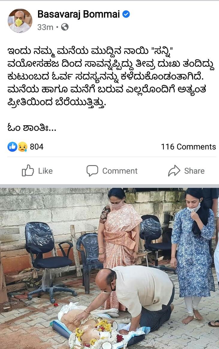 ವಯೋಸಹಜ ರೀತಿಯಲ್ಲಿ ಗೃಹ ಸಚಿವ ಬಸವರಾಜ ಬೊಮ್ಮಾಯಿಯವರ ಸಾಕು ನಾಯಿ ಸನ್ನಿ ಸಾವಿಗೀಡಾಗಿದೆ. ಇದರಿಂದ ಕಣ್ಣೀರಿಡುವ ಸ್ಥಿತಿಯಲ್ಲಿ ಸಚಿವರಿದ್ದು, ಸ್ವತಃ ಮುಂದೆ ನಿಂತು ಅದರ ಕಾರ್ಯವನ್ನ ಮಾಡಿ ಮುಗಿಸಿದ್ದಾರೆ.