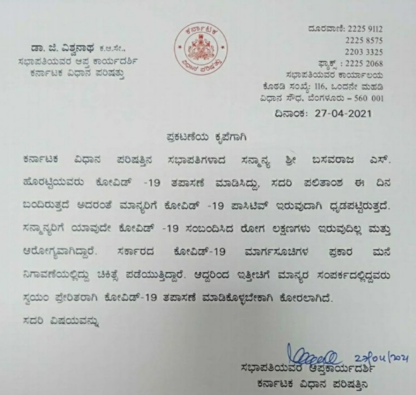 ಕೋವಿಡ್ ತಪಾಸಣೆ ಮಾಡಿದಾಗ ಪಾಸಿಟಿವ್ ಎಂದು ಬಂದಿದ್ದು, ರೋಗ ಲಕ್ಷಣಗಳು ಕಂಡು ಬಂದಿಲ್ಲ. ಕೋವಿಡ್ ನಿಯಮಾವಳಿಗಳ ಪ್ರಕಾರ ಮನೆಯಲ್ಲಿಯೇ ಚಿಕಿತ್ಸೆ ಪಡೆಯುತ್ತಿದ್ದು ಆರೋಗ್ಯವಾಗಿದ್ದಾರೆ ಸಭಾಪತಿ ಬಸವರಾಜ ಹೊರಟ್ಟಿಯವರ ಆಪ್ತ ಸಹಾಯಕರು ಮಾಹಿತಿಯನ್ನ ನೀಡಿದ್ದಾರೆ.