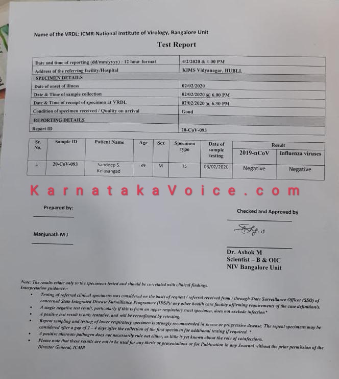 ಬಂತು ಹುಬ್ಬಳ್ಳಿಯ ಕರೋನಾ ಕೇಸ್ ರಿಪೋರ್ಟ