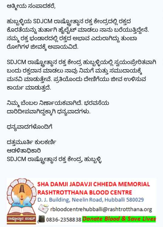 ಸಾರ್ವಜನಿಕರಲ್ಲಿ ಮನವಿ ಮಾಡಿಕೊಂಡಿರುವ ದತ್ತಮೂರ್ತಿ ಕುಲಕರ್ಣಿ ಅವರು, ಸಾಧ್ಯವಾದಷ್ಟು ಜನರು ರಕ್ತ ಭಂಡಾರಕ್ಕೆ ಬಂದು ರಕ್ತ ದಾನವನ್ನ ಮಾಡಬೇಕೆಂದು ಕೋರಿದ್ದಾರೆ.