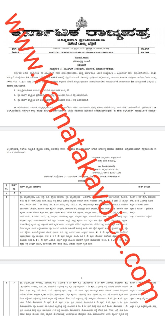 2011ರ ಜನಗಣತಿ ಆಧಾರದ ಮೇಲೆ ಹುಬ್ಬಳ್ಳಿ-ಧಾರವಾಡ ಮಹಾನಗರ ಪಾಲಿಕೆಗೆ ಸಂಬಂಧಿಸಿದಂತೆ ವಾರ್ಡುವಾರು ಕ್ಷೇತ್ರ ಪುನರ್ ವಿಂಗಡನೆ ನಿಗಧಿಸಿಪಡಿಸಿರುವ ಸಂಪೂರ್ಣವಾದ ಕರ್ನಾಟಕ ರಾಜ್ಯಪತ್ರ ಇಲ್ಲಿದೆ.