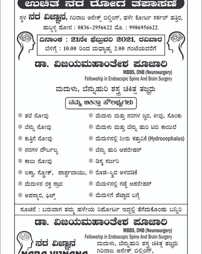 ಮೆದುಳು, ಬೆನ್ನುಹುರಿ ಶಸ್ತ್ರ ಚಿಕಿತ್ಸಕ ತಜ್ಞರಾದ ಡಾ.ವಿಜಯಮಹಾಂತೇಶ ಪೂಜಾರಿಯವರು ಉಚಿತವಾಗಿ ತಪಾಸಣೆ ಮಾಡಲಿದ್ದಾರೆ. ಹುಬ್ಬಳ್ಳಿಯ ಹಳೇ ಕೋರ್ಟ್ ವೃತ್ತದ ಬಳಿಯಿರುವ ಗಿರಿರಾಜ್ ಅನೇಕ್ಸ್ ಬಿಲ್ಡಿಂಗದಲ್ಲಿ ಆಯೋಜನೆ ಮಾಡಲಾಗಿದೆ.