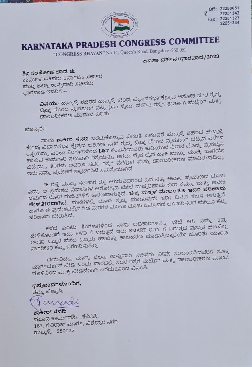 ಹುಬ್ಬಳ್ಳಿ: ಕಳೆದ ಎಂಟು ತಿಂಗಳಿಂದ ಸಮಸ್ಯೆ ಎದುರಿಸುತ್ತಿದ್ದೇವೆ. ಸಂಬಂಧಿಸಿದ ಅಧಿಕಾರಿಗಳು ಯಾರೂ ಅನ್ನುವುದೇ ಗೊತ್ತಾಗುತ್ತಿಲ್ಲ. ನೀವಾದರೂ ಸಂಬಂಧಿಸಿದ ಅಧಿಕಾರಿಗಳಿಗೆ ಹೇಳಿ ಎಂದು ಕೆಪಿಸಿಸಿ ಪ್ರಧಾನ ಕಾರ್ಯದರ್ಶಿ ಶಾಕೀರ ಸನದಿ ಅವರು ಧಾರವಾಡ ಜಿಲ್ಲಾ ಉಸ್ತುವಾರಿ ಸಚಿವ ಸಂತೋಷ ಲಾಡ ಅವರಿಗೆ ಜನತಾದರ್ಶನದ ಮೂಲಕ ಪತ್ರ ಬರೆದಿದ್ದಾರೆ.
