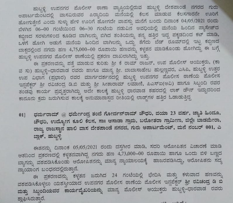 ಹುಬ್ಬಳ್ಳಿ ದೇಶಪಾಂಡೆನಗರದಲ್ಲಿನ ಗುರು ಅಪಾರ್ಟಮೆಂಟಿನ ಮಹೇಶ ಎಂಬುವವರ ಮನೆಯಲ್ಲಿ ಕಾರ್ಯ ನಿರ್ವಹಿಸುತ್ತಿದ್ದ ರಾಜಸ್ಥಾನ ಮೂಲದ ಧರ್ಮರಾಮ್ ಧರ್ಮೆಂದ್ರ ಗೋವರ್ಧನರಾಮ್ ಚೌಧರಿ ಎಂಬಾತನೇ, 475000 ಹಣವನ್ನ ದೋಚಿಕೊಂಡು ಪರಾರಿಯಾಗಿದ್ದ. ಈ ಬಗ್ಗೆ ಉಪನಗರ ಠಾಣೆಯಲ್ಲಿ ಪ್ರಕರಣ ದಾಖಲಾಗಿತ್ತು.