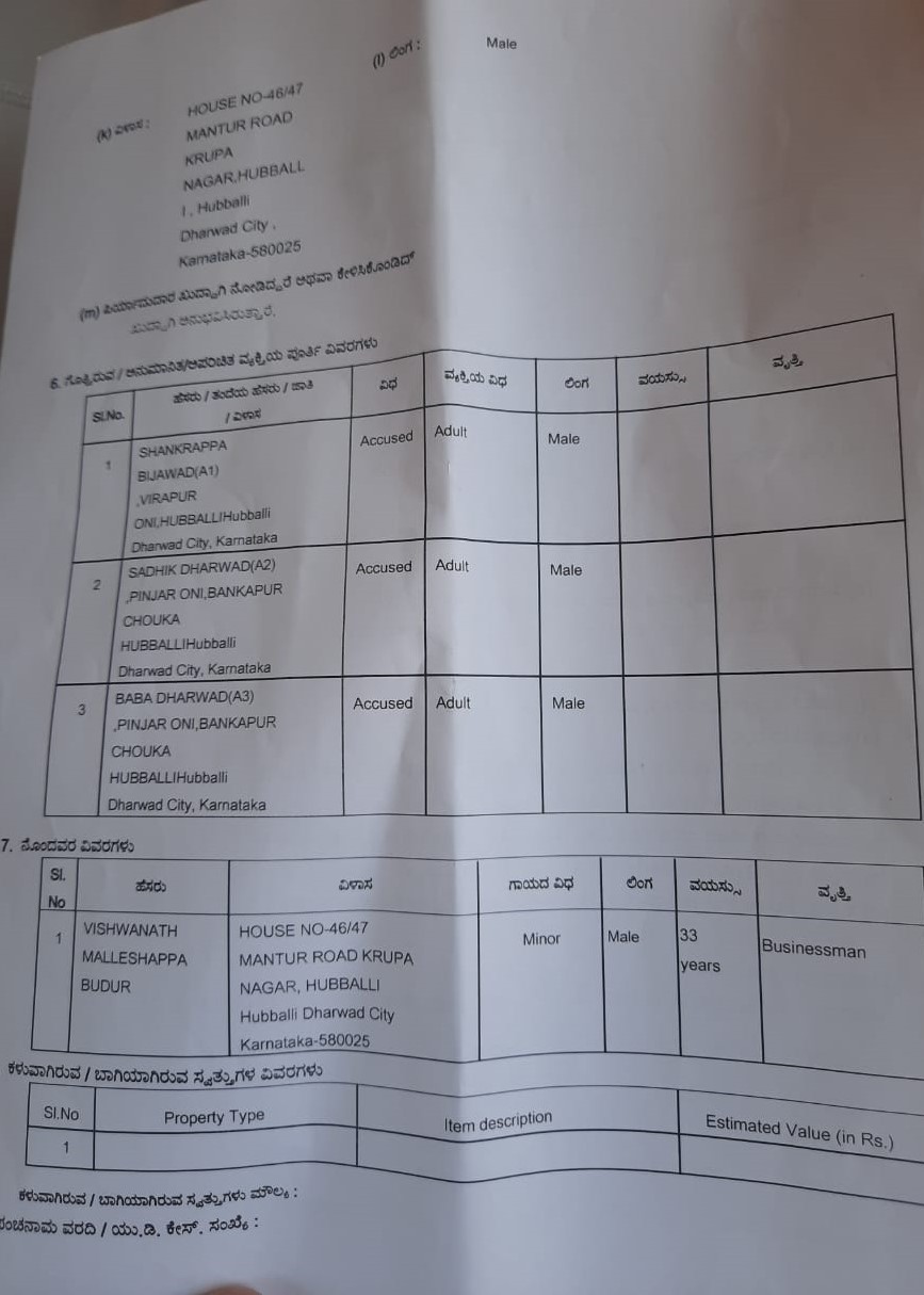 ಹುಬ್ಬಳ್ಳಿಯ ಮಂಟೂರ ರಸ್ತೆಯ ಕೃಪಾ ನಗರದ ನಿವಾಸಿ ವಿಶ್ವನಾಥ ಮಲ್ಲೇಶಪ್ಪ ಬೂದೂರು ನೀಡಿದ ದೂರಿನ ಮೇಲೆ ಶಂಕರಣ್ಣ ಬಿಜವಾಡ, ಸಾಧಿಕ ಧಾರವಾಡ ಹಾಗೂ ಬಾಬಾ ಧಾರವಾಡ ಎಂಬುವವರ ಮೇಲೆ ಎಪಿಎಂಸಿ ನವನಗರ ಠಾಣೆಯಲ್ಲಿ ಪ್ರಕರಣ ದಾಖಲಾಗಿದೆ.