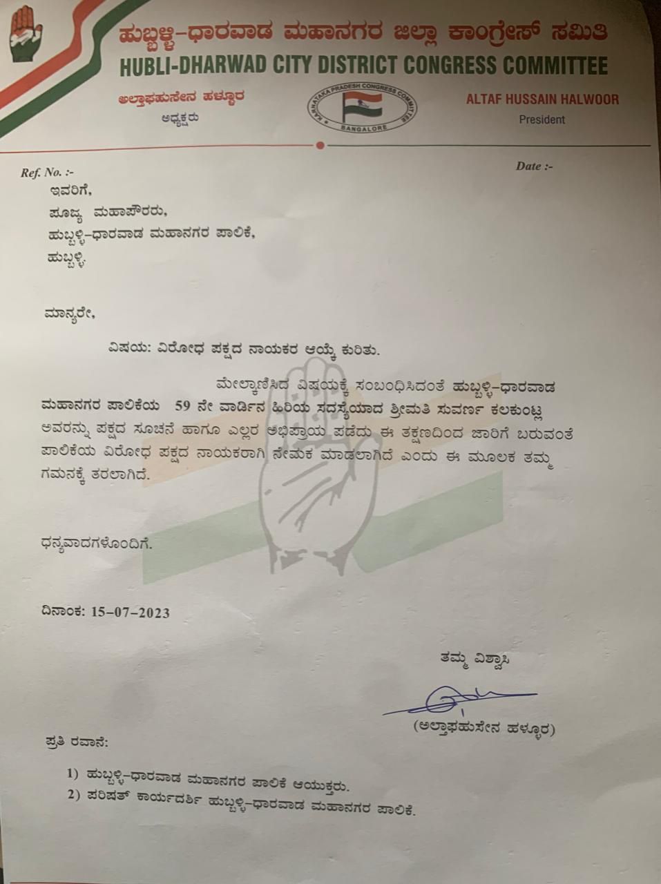 ಹುಬ್ಬಳ್ಳಿ: ಹುಬ್ಬಳ್ಳಿ ಧಾರವಾಡ ಮಹಾನಗರ ಪಾಲಿಕೆಯಲ್ಲಿ ವಿರೋಧ ಪಕ್ಷದ ನಾಯಕರನ್ನಾಗಿ ಮಹಿಳಾ ಸದಸ್ಯೆಯನ್ನ ನೇಮಕ ಮಾಡುವ ಮೂಲಕ ಕಾಂಗ್ರೆಸ್ ಇತಿಹಾಸ ಸೃಷ್ಟಿಸಿದೆ.