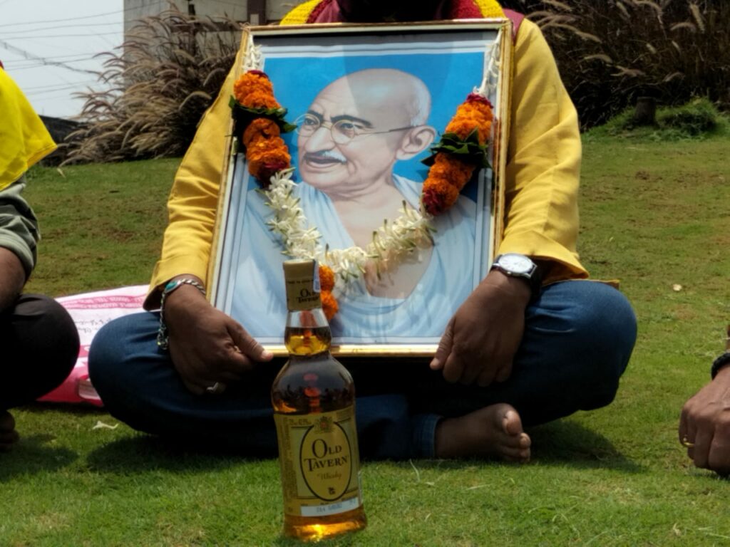 ಮಹಾತ್ಮಾ ಗಾಂಧೀಜಿಯವರ ಭಾವಚಿತ್ರವನ್ನ ಹಿಡಿದುಕೊಂಡಿರುವ ಹೋರಾಟಗಾರರು, ಅದರ ಮುಂದೆ ವಿಸ್ಕಿ ಬಾಟಲ್ ಇಟ್ಟುಕೊಂಡು ವ್ಯವಸ್ಥೆಯ ಸರಿಪಡಿಸಿ ಎಂದು ಆಗ್ರಹಿಸಿದರು.