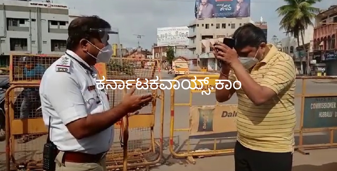 ಹುಬ್ಬಳ್ಳಿ: ನಗರದಲ್ಲಿ ಸಂಪೂರ್ಣ ಲಾಕ್ ಡೌನ್ ಮಾಡಿ ಆದೇಶ ಮಾಡಿರುವ ಹಿನ್ನೆಲೆಯಲ್ಲಿ ತಪಾಸಣೆಗೆ ಇಳಿದ ಉತ್ತರ ಸಂಚಾರಿ ಠಾಣೆ ಇನ್ಸಪೆಕ್ಟರ್ ಶ್ರೀಕಾಂತ ತೋಟಗಿ ಬೆಳ್ಳಂಬೆಳಿಗ್ಗೆ ತಪ್ಪು ಮಾಡಿದವರ ಕೈ ಮುಗಿಯುವ ಸ್ಥಿತಿಗೆ ತಲುಪಿದ್ದರು.
