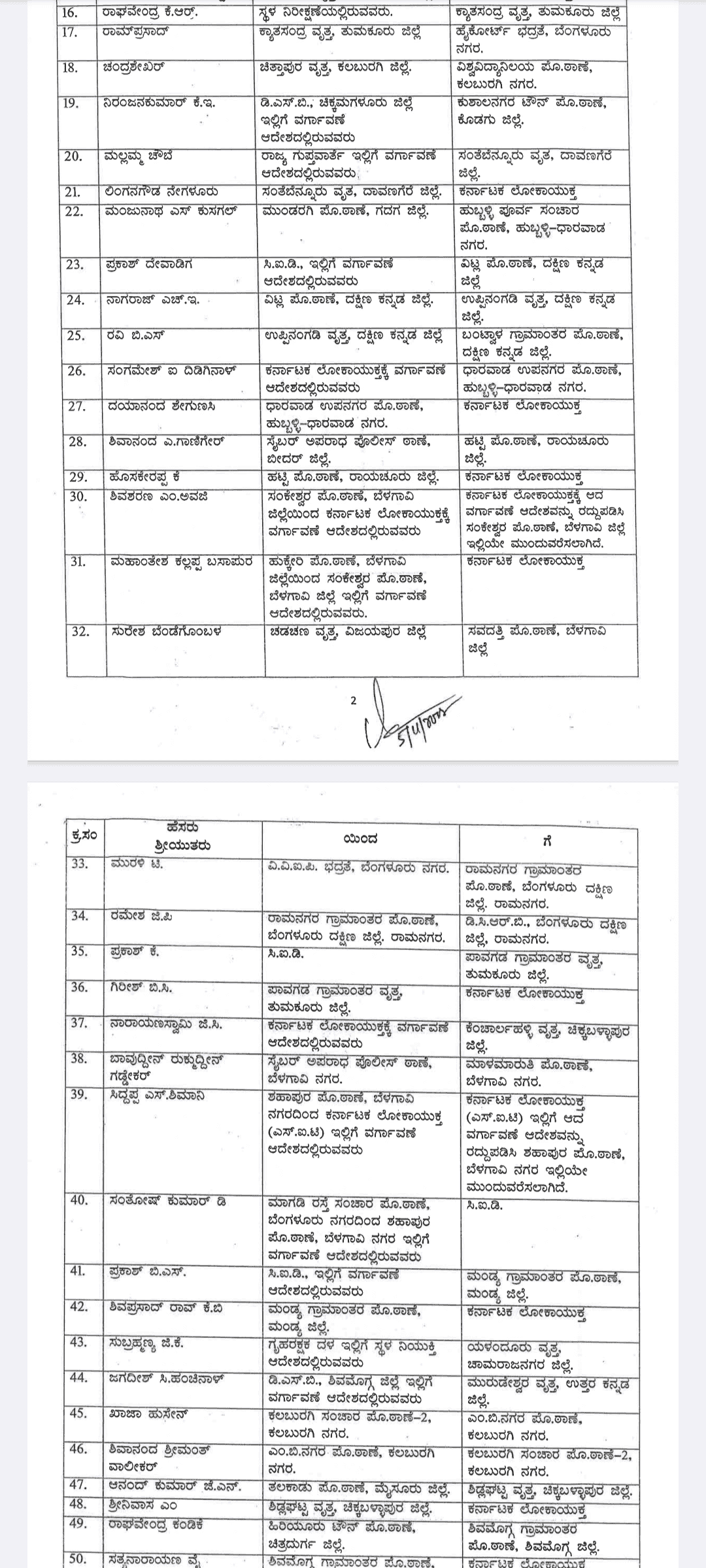 ಧಾರವಾಡ ಉಪನಗರ ಠಾಣೆಯ ದಯಾನಂದ ಶೇಗುಣಿಸಿ ಅವರನ್ನ ಲೋಕಾಯುಕ್ತಕ್ಕೆ ವರ್ಗಾವಣೆ ಮಾಡಿದ್ದು, ಅವರಿದ್ದ ಸ್ಥಾನಕ್ಕೆ ಸಂಗಮೇಶ ದಿಡಿಗನಾಳ ಅವರನ್ನ ವರ್ಗಾಯಿಸಲಾಗಿದೆ. ರಾಘವೇಂದ್ರ ಹಳ್ಳೂರ ತರಬೇತಿ ಶಾಲೆಗೆ ವರ್ಗಾವಣೆಗೊಂಡಿದ್ದಾರೆ.