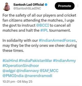 ಆಪರೇಷನ್‌ ಸಿಂಧೂರ ನಂತರ ಕೆಲವು ಐಪಿಎಲ್‌ ಪಂದ್ಯಗಳನ್ನು ಸ್ಥಳಾಂತರ ಮಾಡಲಾಗಿದೆ. ಇದೀಗ ಎಲ್ಲಾ ಪಂದ್ಯಗಳನ್ನು ಸ್ಥಗಿತಗೊಳಿಸಿದರೆ ಒಳ್ಳೆಯದು. ಕ್ರಿಕೆಟ್‌ ವೀಕ್ಷಿಸಲು ಸಾಕಷ್ಟು ಜನರು ಬರುತ್ತಾರೆ. ಆದ್ದರಿಂದ ಬಿಸಿಸಿಐ ಇನ್ನು ಮುಂದಿನ ಎಲ್ಲಾ ಪಂದ್ಯಗಳನ್ನು ನಿಲ್ಲಿಸಬೇಕು. ಈ ನಿಟ್ಟಿನಲ್ಲಿ ಸರ್ಕಾರ ಬಿಸಿಸಿಐ ಗೆ ಸೂಚನೆ ನೀಡಬೇಕು ಎಂದು ಲಾಡ್‌ ಅವರು ತಿಳಿಸಿದ್ದಾರೆ.