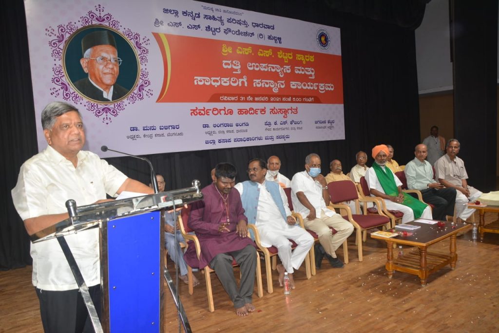 ಜಿಲ್ಲಾ ಕನ್ನಡ ಸಾಹಿತ್ಯ ಪರಿಷತ್ ಹಾಗೂ ಎಸ್.ಎಸ್. ಶೆಟ್ಟರ್ ಫೌಂಡೇಷನ್ ವತಿಯಿಂದ ದಿವಂಗತ ಎಸ್.ಎಸ್. ಶೆಟ್ಟರ್ ಸ್ಮರಣಾರ್ಥ ಭಾನುವಾರ ನಗರದ ಸವಾಯಿ ಗಂಧರ್ವ ಹಾಲ್’ನಲ್ಲಿ ಏರ್ಪಡಿಸಲಾದ ದತ್ತಿ ಉಪನ್ಯಾಸ ಮತ್ತು ಸಾಧಕರಿಗೆ ಸನ್ಮಾನ ಕಾರ್ಯಕ್ರಮದ ಅಧ್ಯಕ್ಷತೆ ವಹಿಸಿ ಅವರು ಮಾತನಾಡಿದರು.
