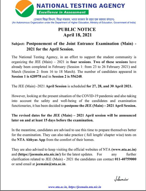 ಈ ಕುರಿತು ಟ್ವೀಟ್ ಮೂಲಕ ಮಾಹಿತಿ ನೀಡಿರುವ ಕೇಂದ್ರ ಶಿಕ್ಷಣ ಸಚಿವ ರಮೇಶ್ ಪೋಖರಿಯಾಲ್ ನಿಶಾಂಕ್, “ಕೊರೊನಾ ಪರಿಸ್ಥಿತಿಯನ್ನು ಗಮನದಲ್ಲಿಟ್ಟುಕೊಂಡು NTAಗೆ , JEE MAIN 2021 ರ ಏಪ್ರಿಲ್ ಸೆಷನ್ ಅನ್ನು ಸ್ಥಗಿತಗೊಳಿಸಲು ಸಲಹೆ ನೀಡಲಾಗಿದೆ. ವಿದ್ಯಾರ್ಥಿಗಳ ಸುರಕ್ಷತೆ ಹಾಗೂ ಅವರ ಶೈಕ್ಷಣಿಕ ಕರಿಯರ್ ಶಿಕ್ಷಣ ಸಚಿವಾಲಯದ ಪ್ರಮುಖ ಜವಾಬ್ದಾರಿಯಾಗಿದೆ” ಎಂದು ಹೇಳಿದ್ದಾರೆ.