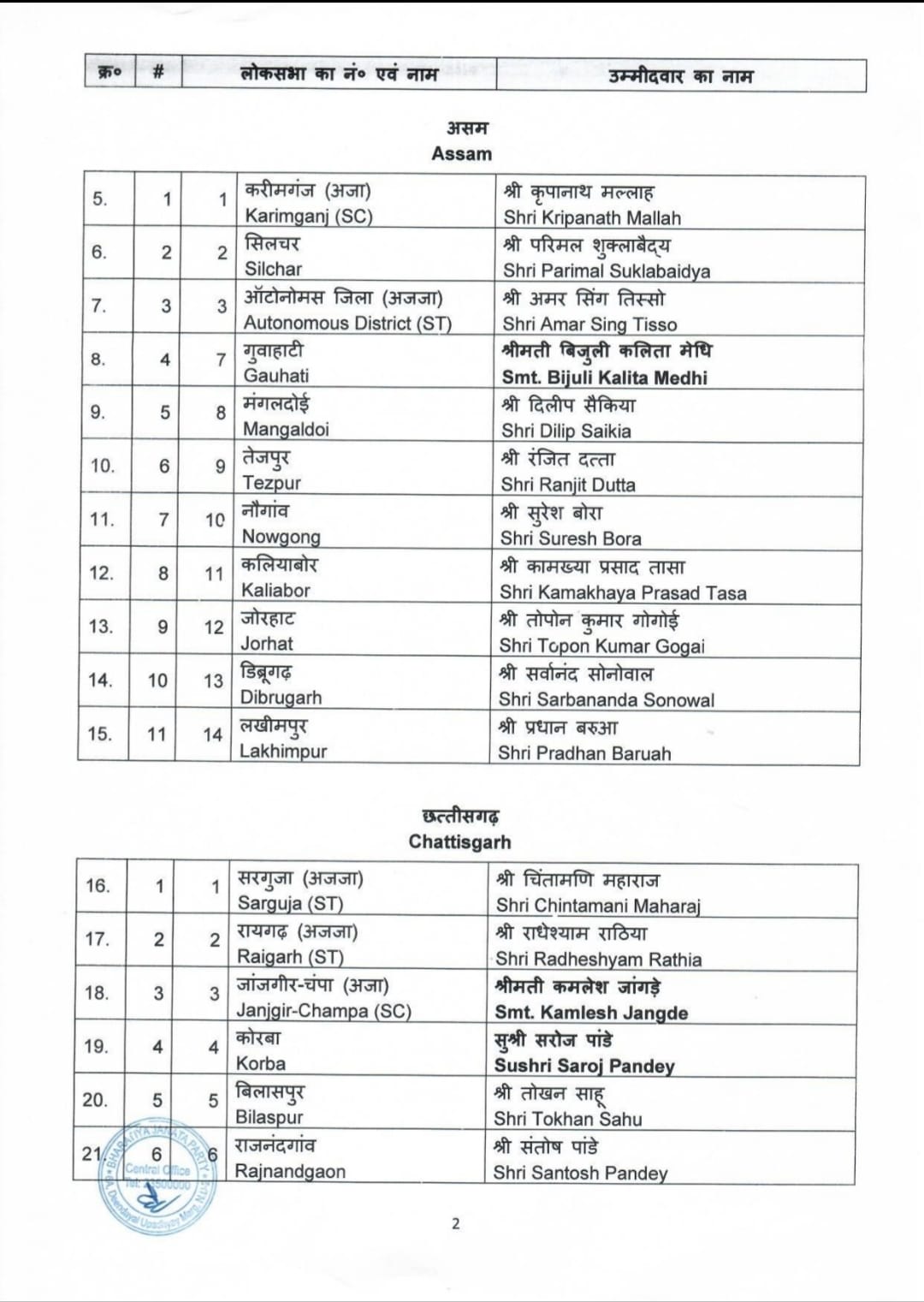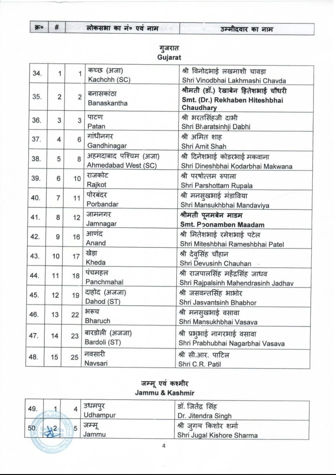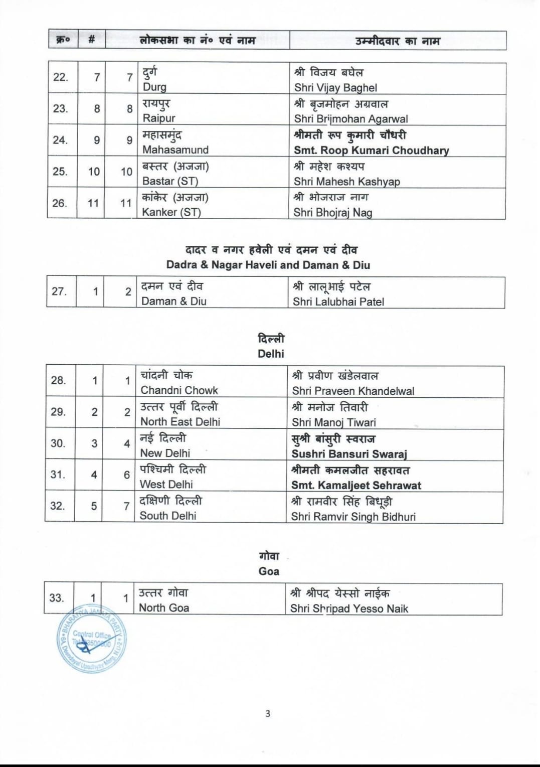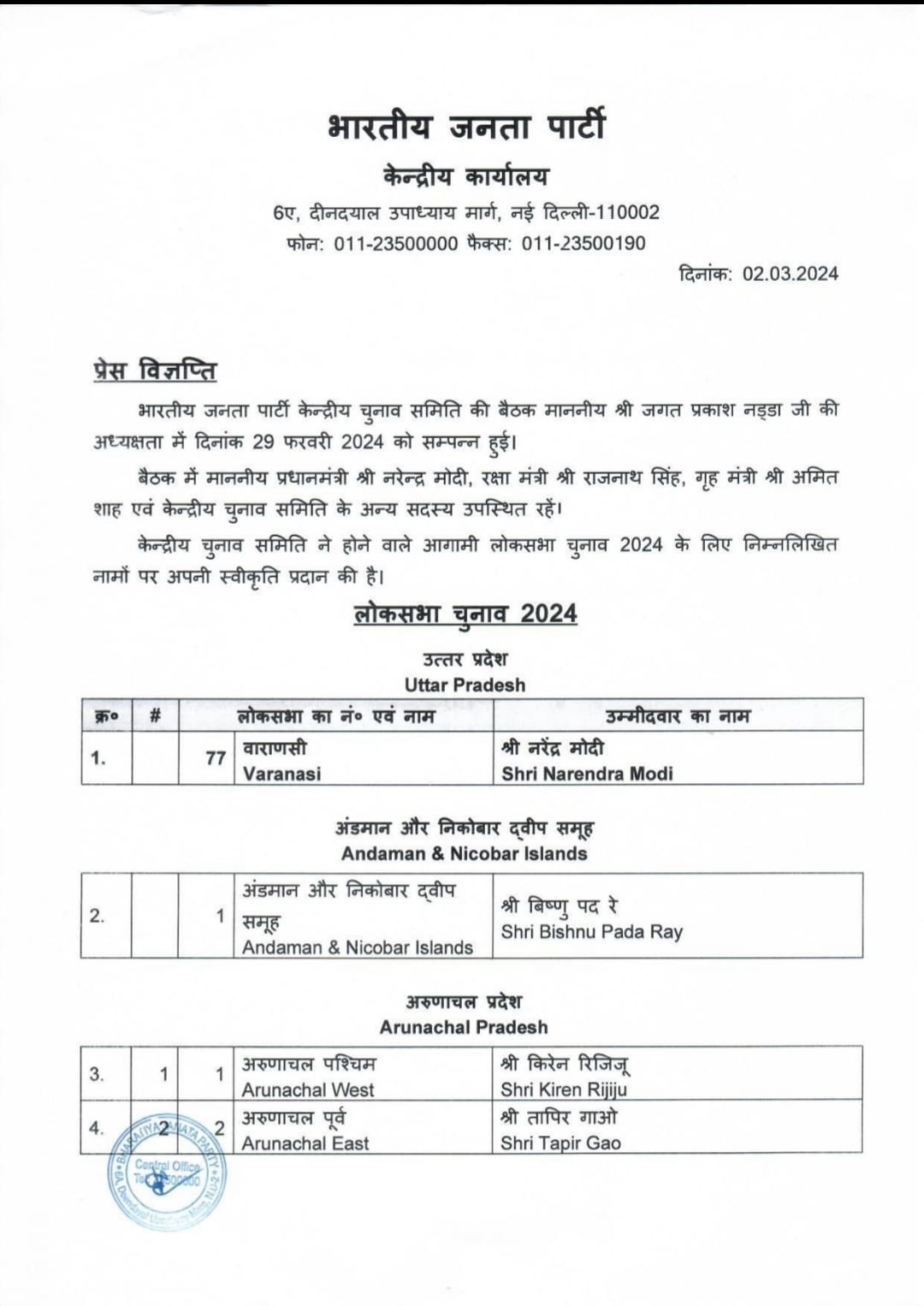 ನವದೆಹಲಿಯ ಪಕ್ಷದ ಕಚೇರಿಯಲ್ಲಿ ಸುದ್ದಿಗೋಷ್ಠಿಯಲ್ಲಿ ಬಿಜೆಪಿ ನಾಯಕರು ಲೋಕಸಭೆ ಚುನಾವಣೆಗೆ ಪಟ್ಟಿ ಬಿಡುಗಡೆ ಮಾಡಿದರು. ಬಿಜೆಪಿ ರಾಷ್ಟ್ರೀಯ ಪ್ರಧಾನ ಕಾರ್ಯದರ್ಶಿ ವಿನೋದ ತಾವ್ಡೆ ಈ ಮಾಹಿತಿ ನೀಡಿದರು.