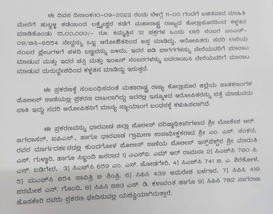 ಕೊಲ್ಲಾಪುರದಲ್ಲಿ ಕದ್ದ ಲಾರಿಯನ್ನ “ಕುಂದಗೋಳ ಬಳಿ” ಪತ್ತೆ ಹಚ್ಚಿದ ‘ಸಿಪಿಐ ಮಾರುತಿ ಗುಳ್ಳಾರಿ ಟೀಂ’…