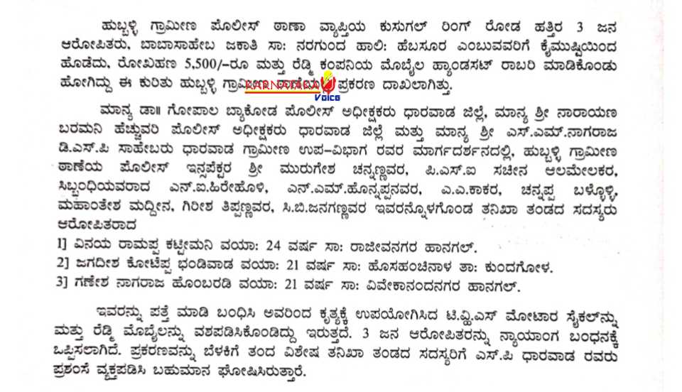ಪೊಲೀಸ್ ಇನ್ಸಪೆಕ್ಟರ್ ಮುರಗೇಶ ಚೆನ್ನಣ್ಣನವರ ನೇತೃತ್ವದಲ್ಲಿ ಪಿಎಸ್ಐ ಸಚಿನ ಅಲಮೇಲಕರ, ಸಿಬ್ಬಂದಿಗಳಾದ ಎಸ್.ಐ.ಹಿರೇಹೊಳಿ, ಎನ್.ಎಂ.ಹೊನ್ನಪ್ಪನವರ, ಎ.ಎ.ಕಾಕರ, ಚೆನ್ನಪ್ಪ ಬಳ್ಳೊಳ್ಳಿ, ಮಹಾಂತೇಶ ಮದ್ದಿನ, ಗಿರೀಶ್ ತಿಪ್ಪಣ್ಣನವರ, ಸಿ.ಬಿ.ಜನಗಣ್ಣನವರ ಕಾರ್ಯಾಚರಣೆಯಲ್ಲಿ ಭಾಗವಹಿಸಿದ್ದರು.
