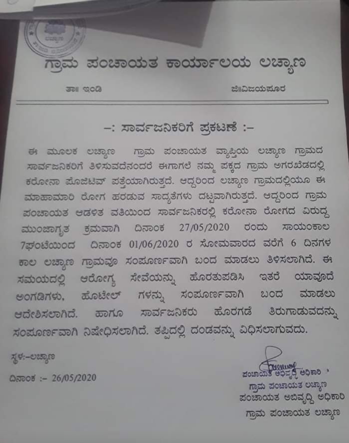 ಜಿಲ್ಲೆಯ ಇಂಡಿ ತಾಲೂಕಿನ ಲಚ್ಯಾಣ ಗ್ರಾಮದಲ್ಲಿ ಇಂತಹ ಸ್ಥಿತಿ ನಿರ್ಮಾಣವಾಗಿದ್ದು, ಇಂದು ಸಂಜೆ 7 ಗಂಟೆಯಿಂದ ಜೂನ್1 ರ ವರೆಗೆ ಬಂದ್ ಮಾಡಲಾಗುತ್ತಿದೆ. ಪಕ್ಕದ ಗ್ರಾಮಕ್ಕೆ ಕೊರೋನಾ‌ ಹೆಮ್ಮಾರಿ ಬಂದಿರುವ ಹಿನ್ನೆಲೆಯಲ್ಲಿ ಲಚ್ಯಾಣ ಗ್ರಾಮ ಪಂಚಾಯತ್ ಪ್ರಕಟಣೆ ಹೊರಡಿಸಿದೆ.