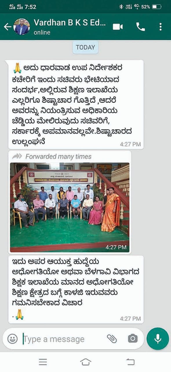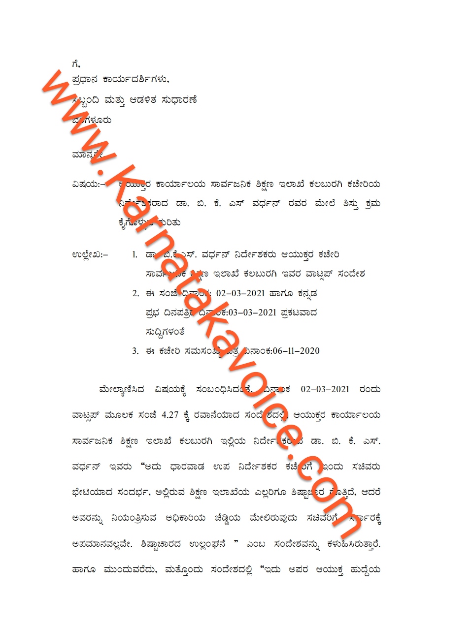 ಧಾರವಾಡ: ಶಿಕ್ಷಣ ಇಲಾಖೆಯ ಕಲಬುರಗಿ ಆಯುಕ್ತಾಲಯದ ನಿರ್ದೇಶಕ ಡಾ.ಬಿಕೆಎಸ್ ವರ್ಧನರ ವಿರುದ್ಧ, ಸಾರ್ವಜನಿಕ ಶಿಕ್ಷಣ ಇಲಾಖೆ ಆಪರ್ ಆಯುಕ್ತ ಮೇಜರ್ ಸಿದ್ಧಲಿಂಗಯ್ಯ ಹಿರೇಮಠ ಸರ್ಕಾರಕ್ಕೆ ದೂರು ಸಲ್ಲಿಸಿದ್ದಾರೆ.