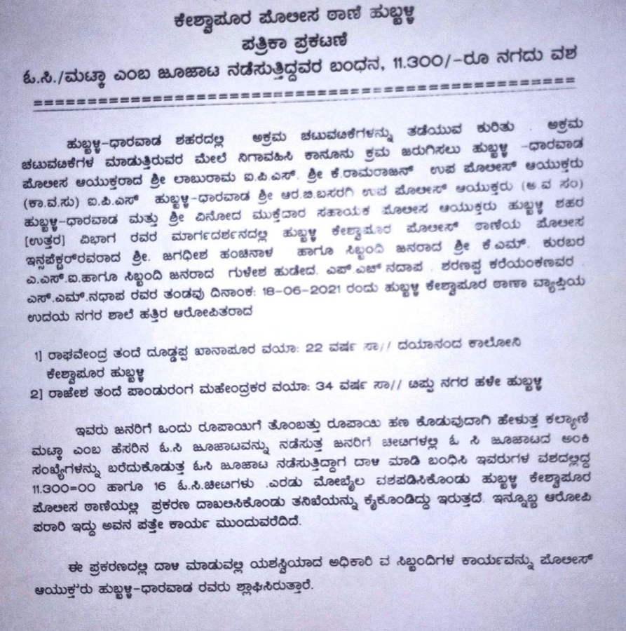 ಹುಬ್ಬಳ್ಳಿ ಉದಯನಗರದಲ್ಲಿ ಮಟಕಾ ಕುಳ ರಾಘವೇಂದ್ರ, ರಾಜೇಶ ಬಂಧಿಸಿದ ಕೇಶ್ವಾಪುರ ಠಾಣೆ ಪೊಲೀಸರು…!