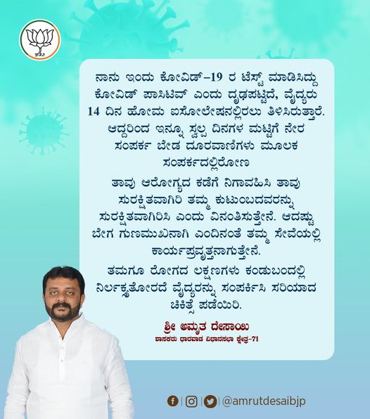 ನಾನು ಇಂದು ಕೋವಿಡ್-19 ರ ಟೆಸ್ಟ್ ಮಾಡಿಸಿದ್ದು ಕೋವಿಡ್ ಪಾಸಿಟಿವ್ ಎಂದು ದೃಢಪಟ್ಟಿದೆ, ವೈದ್ಯರು 14 ದಿನ ಹೋಮ ಐಸೋಲೇಷನಲ್ಲಿರಲು ತಿಳಿಸಿರುತ್ತಾರೆ. ಆದ್ದರಿಂದ ಇನ್ನೂ ಸ್ವಲ್ಪ ದಿನಗಳ ಮಟ್ಟಿಗೆ ನೇರ ಸಂಪರ್ಕ ಬೇಡ ದೂರವಾಣಿಗಳು ಮೂಲಕ ಸಂಪರ್ಕದಲ್ಲಿರೋಣ