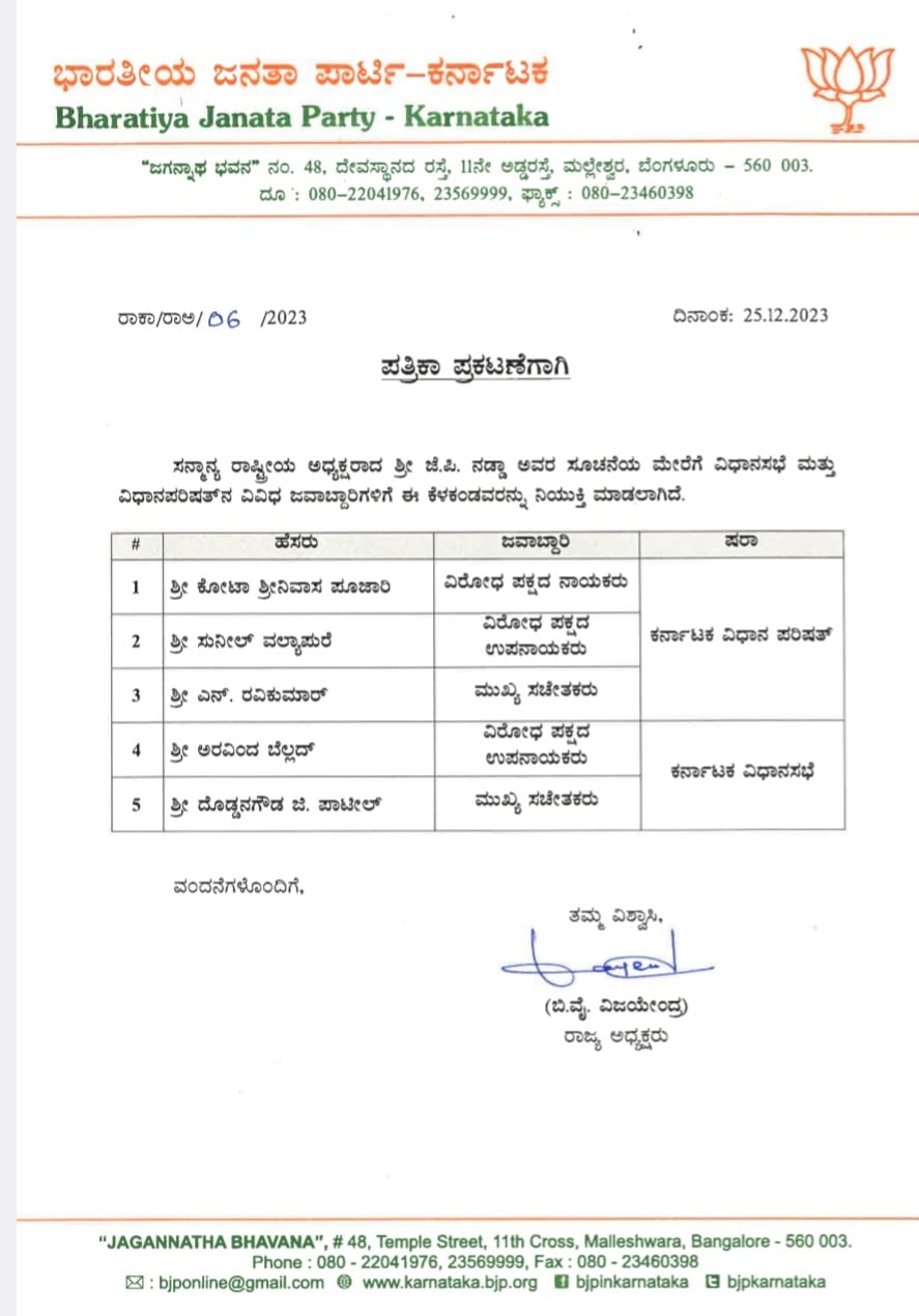 ಇನ್ನುಳಿದಂತೆ ವಿಧಾನಪರಿಷತ್ ವಿರೋಧ ಪಕ್ಷದ ನಾಯಕರನ್ನಾಗಿ ಕೋಟಾ ಶ್ರೀನಿವಾಸ ಪೂಜಾರಿ ಅವರನ್ನ ನೇಮಕ ಮಾಡಲಾಗಿದೆ. ಎನ್.ರವಿಕುಮಾರ ಅವರನ್ನ ಮುಖ್ಯ ಸಚೇತಕರನ್ನಾಗಿಸಲಾಗಿದೆ.