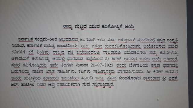 ಜುಲೈ 21 ರಂದು ಬೆಳಗಾವಿಯ ಕನ್ನಡ ಭವನದಲ್ಲಿ ನಡೆಯಲಿರುವ ರಾಜ್ಯಮಟ್ಟದ ಯುವ ಕವಿಗೋಷ್ಠಿಯಲ್ಲಿ ಕಿರಣ ಅರಮನೆ ಭಾಗವಹಿಸಲಿದ್ದಾರೆ.