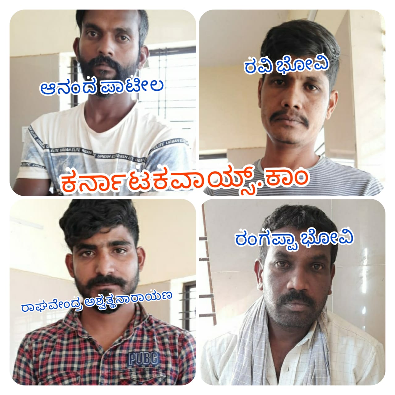 ಬಂಧಿತರನ್ನ ಶಿಕಾರಿಪುರ ತಾಲೂಕಿನ ಕಳೇನಹಳ್ಳಿ ಗ್ರಾಮದವರಾದ ರವಿ ಬಸವರಾಜ ಭೋವಿ, ರಂಗಪ್ಪ ತಿಮ್ಮಪ್ಪ ಭೋವಿ, ಪಾವಗಡ ತಾಲೂಕಿನ ಕೋಮಾರಹಳ್ಳಿಯ ರಾಘವೇಂದ್ರ ಅಶ್ವತ್ಥ ನಾರಾಯಣ ಹಾಗೂ ಹುಬ್ಬಳ್ಳಿಯ ರಾಮಲಿಂಗೇಶ್ವನಗರದ ಆನಂದ ರುದ್ರಗೌಡ ಪಾಟೀಲ ಎಂಬುವವರನ್ನ ಬಂಧನ ಮಾಡಲಾಗಿದೆ.