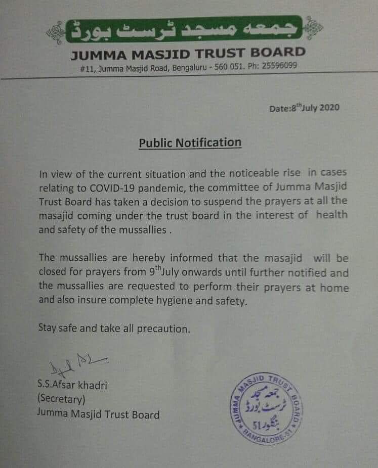ಮನೆಯಲ್ಲೇ ನಮಾಜ್ ಮಾಡಿ: ಜುಮ್ಮಾ ಮಸೀದಿ ಟ್ರಸ್ಟ್ ಬೋರ್ಡ್ ಆದೇಶ