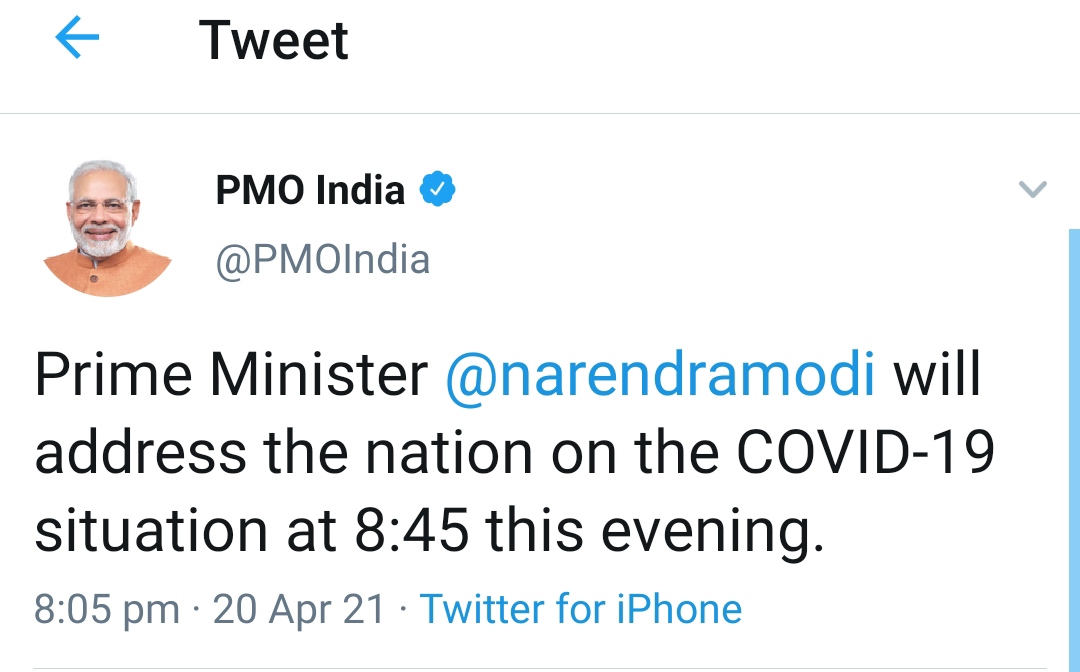 ನವದೆಹಲಿ: ದೇಶದಲ್ಲಿ ಕೊರೋನಾ ಹೆಚ್ಚುತ್ತಿರುವ ಹಿನ್ನೆಲೆಯಲ್ಲಿ ಪ್ರಧಾನಿ ನರೇಂದ್ರ ಮೋದಿಯವರು 8.45ಕ್ಕೆ ಮಾತನಾಡಲಿದ್ದಾರೆ. ಈ ವಿಷಯವನ್ನ ಸ್ವತಃ ಪಿಎಂಓ ಕಚೇರಿಯ ಟ್ವೀಟನಲ್ಲಿ ಹೇಳಲಾಗಿದೆ.