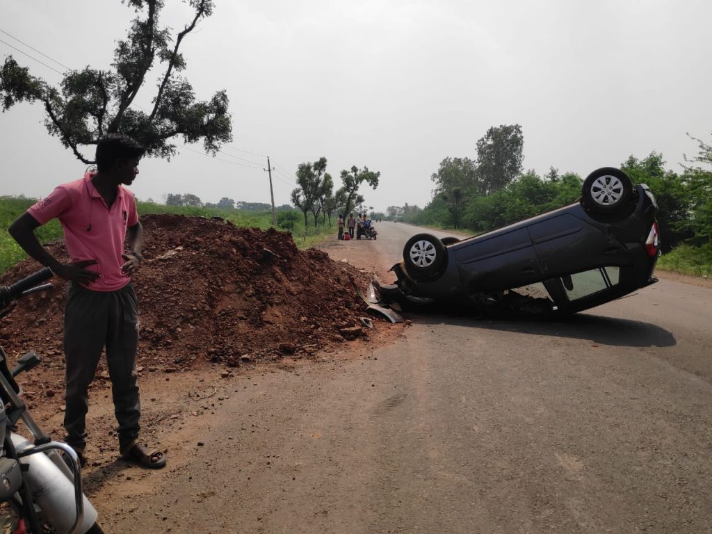 ನವಲಗುಂದ ಬಳಿ ಕಾರು ಪಲ್ಟಿ- ಜೆಸಿಬಿ ಏರಿಸಲು ಹಾಕಿದ್ದ ಮಣ್ಣೆ ಕಾರಣ