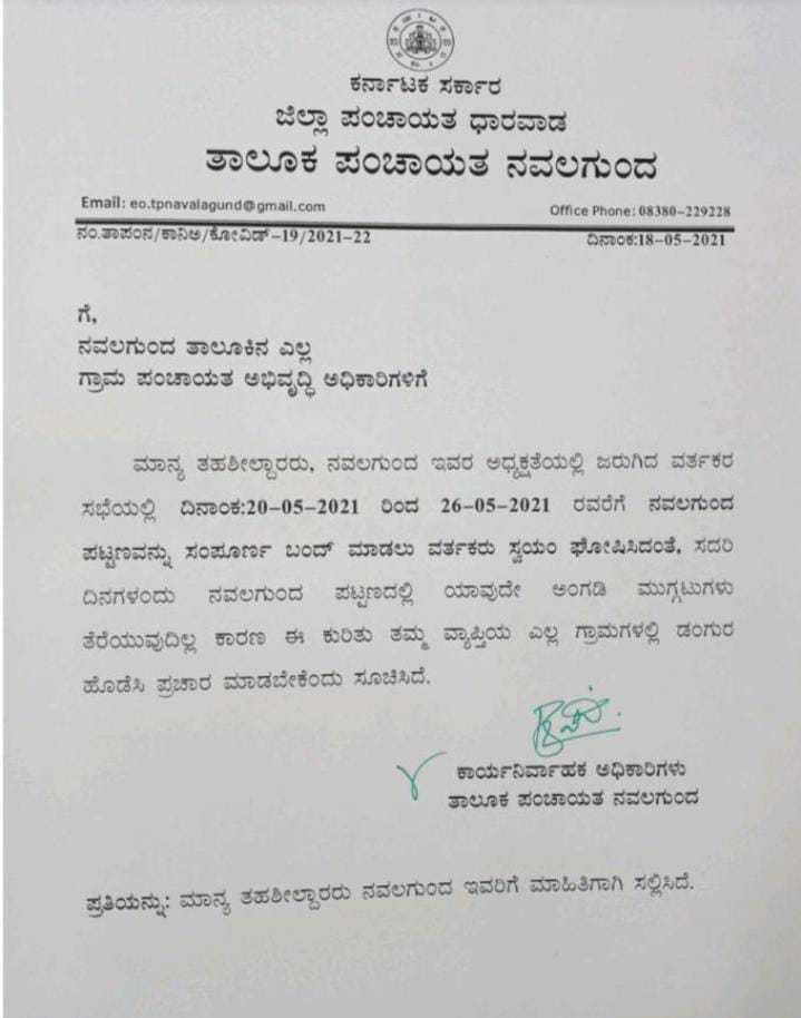 ತಹಶೀಲ್ದಾರ ಆದೇಶದ ಹಿನ್ನೆಲೆಯಲ್ಲಿ ನವಲಗುಂದ ಪಟ್ಟಣಕ್ಕೆ ಯಾರೂ ಬರದಂತೆ ಪ್ರತಿಯೊಂದು ಗ್ರಾಮ ಪಂಚಾಯತಿಗಳಿಗೂ ಕಾರ್ಯನಿರ್ವಾಹಕ ಅಧಿಕಾರಿಗಳು ನೋಟೀಸ್ ಜಾರಿಗೊಳಿಸಿದ್ದಾರೆ.