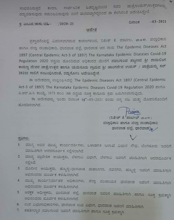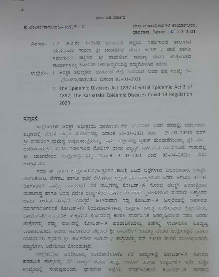 ಧಾರವಾಡ: ಕೋವಿಡ್ ಹೆಚ್ಚುತ್ತಿರುವ ನೆರೆ ರಾಜ್ಯಗಳಿಂದ ಲಕ್ಷಾಂತರ ಭಕ್ತ ಸಮೂಹ ಬರುವ ಸಾಧ್ಯತೆಗಳು ಇರುವುದರಿಂದ ನವಲಗುಂದ ಪಟ್ಟಣದ ಶ್ರೀ ರಾಮಲಿಂಗ ಕಾಮಣ್ಣ ದೇವರ ಉತ್ಸವ ಹಾಗೂ ಯಮನೂರನಲ್ಲಿ ನಡೆಯುವ ಚಾಂಗದೇವರ ಉರುಸ್ ಹಾಗೂ ಜಾತ್ರೆಯನ್ನ ರದ್ದುಗೊಳಿಸಿ ಜಿಲ್ಲಾಧಿಕಾರಿ ನಿತೇಶ ಪಾಟೀಲ ಆದೇಶ ಹೊರಡಿಸಿದ್ದಾರೆ.