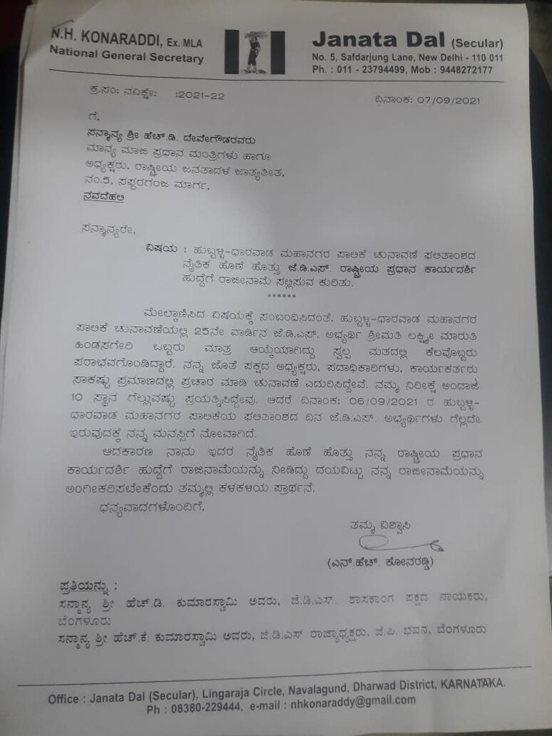 ಜೆಡಿಎಸ್ ರಾಷ್ಟ್ರೀಯ ಪ್ರಧಾನ ಕಾರ್ಯದರ್ಶಿ ಹುದ್ದೆಗೆ ಎನ್.ಎಚ್.ಕೋನರೆಡ್ಡಿ ರಾಜೀನಾಮೆ…!