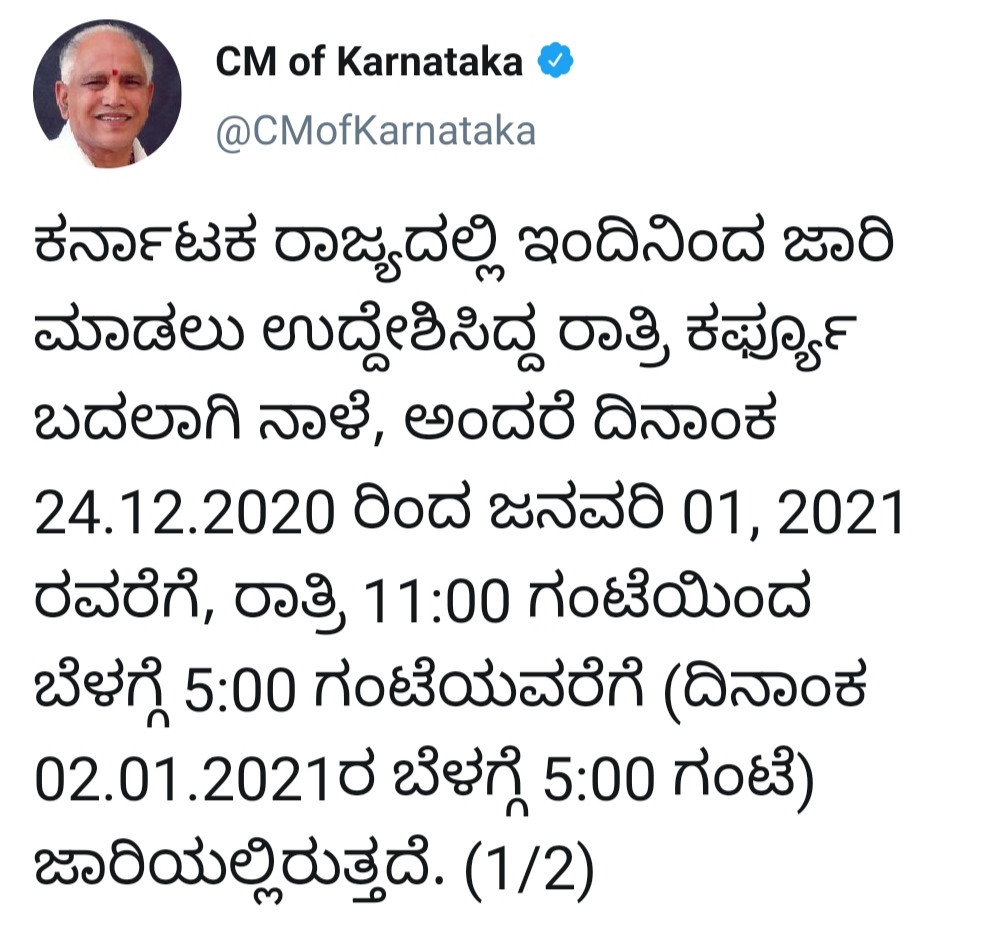 ಬೆಂಗಳೂರು: ಕೊರೋನಾ ರೂಪಾಂತರ ವೈರಾಣು ಭೀತಿಯಿಂದ ಮುಂಜಾಗ್ರತಾ ಕ್ರಮವಾಗಿ ಇಂದು ರಾತ್ರಿಯಿಂದ ಜನವರಿ 2 ರವರೆಗೆ ರಾಜ್ಯಾಧ್ಯತ ರಾತ್ರಿ 10 ರಿಂದ 2 ರವರೆಗೆ ಕರ್ಫ್ಯೂ ಜಾರಿ ಮಾಡಲಾಗಿದೆ ಎಂದು ಮುಖ್ಯಮಂತ್ರಿ ಬಿ.ಎಸ್.ಯಡಿಯೂರಪ್ಪ ಪ್ರಕಟಿಸಿದ್ದರು, ಇದಾದ ಕೆಲವೇ ಗಂಟೆಗಳಲ್ಲಿ ಟ್ವೀಟ್ ಮಾಡಿದ್ದು, ನಾಳೆಯಿಂದ ಕರ್ಪ್ಯೂ ಜಾರಿಗೆ ಬರಲಿದೆ ಎಂದಿದ್ದಾರೆ.