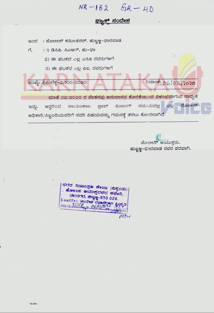 ಹುಬ್ಬಳ್ಳಿ: ಫೆಬ್ರುವರಿ ತಿಂಗಳ ಸಂಬಳ ಕೊಡದಿರುವುದಕ್ಕೆ ಪೊಲೀಸ್ ಆಯುಕ್ತರ ವಿವರಣೆ