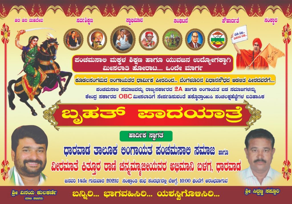 ಧಾರವಾಡ ತಾಲೂಕು ಲಿಂಗಾಯತ ಪಂಚಮಸಾಲಿ ಸಮಾಜ ಹಾಗೂ ಧಾರವಾಡದ ವೀರಮಾತೆ ಕಿತ್ತೂರ ರಾಣಿ ಚೆನ್ನಮ್ಮಾಜೀಯವರ ಅಭಿಮಾನಿ ಬಳಗದ ಪದಾಧಿಕಾರಿಗಳು ಪಾದಯಾತ್ರೆಯಲ್ಲಿ ಭಾಗವಹಿಸಲಿದ್ದು, ಸಮಾಜದ ಮುಖಂಡ ಸಿದ್ದಣ್ಣ ಸಪ್ಪೂರಿ ಎಲ್ಲರನ್ನೂ ಆಹ್ವಾನ ಮಾಡಿದ್ದಾರೆ.