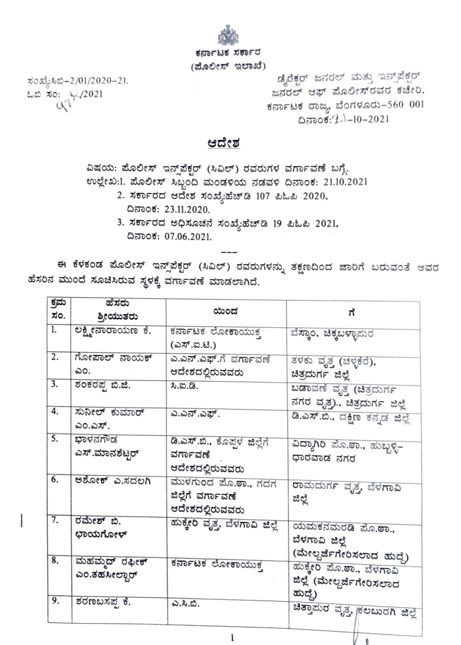 ಬೆಂಗಳೂರು: ರಾಜ್ಯ ಸರ್ಕಾರ ಮೂವತ್ತು ಇನ್ಸಪೆಕ್ಟರ್ ಗಳನ್ನ ವರ್ಗಾವಣೆ ಮಾಡಿಆದೇಶ ಹೊರಡಿಸಿದ್ದು, ಅದರಲ್ಲಿ ಧಾರವಾಡ ವಿದ್ಯಾಗಿರಿ ಠಾಣೆ ಇನ್ಸಪೆಕ್ಟರ್ ಮಹಾಂತೇಶ ಬಸಾಪೂರ ಕೂಡಾ ವರ್ಗಾವಣೆ ಮಾಡಲಾಗಿದೆ.