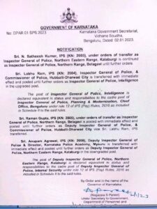 ಬೆಂಗಳೂರು: ರಾಜ್ಯ ಸರಕಾರ ನಾಲ್ಕು ಐಪಿಎಸ್ ಅಧಿಕಾರಿಗಳನ್ನ ವರ್ಗಾವಣೆ ಮಾಡಿ ಆದೇಶ ಹೊರಡಿಸಿದ್ದು, ಹುಬ್ಬಳ್ಳಿ ಧಾರವಾಡ ಪೊಲೀಸ್ ಕಮೀಷನರ್ ಲಾಬುರಾಮ್ ಅವರನ್ನೂ ವರ್ಗಾವಣೆ ಮಾಡಲಾಗಿದೆ.