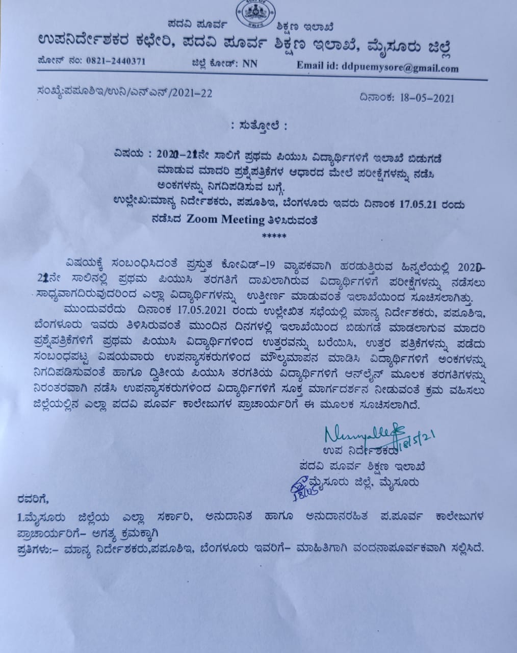 ಈಗಾಗಲೇ ಪಿಯುಸಿ ಪ್ರಥಮ ವರ್ಷದ ವಿದ್ಯಾರ್ಥಿಗಳನ್ನ ಪಾಸ್ ಮಾಡುವಂತೆ ಇಲಾಖೆ ಸೂಚನೆ ನೀಡಿತ್ತು. ಈಗ ಮತ್ತೆ ರಾಜ್ಯದ ಪ್ರತಿಯೊಂದು ಅಧಿಕಾರಿಗಳ ಜೊತೆ ಜೂಮ್ ಮೀಟ್ ಮಾಡಿ, ಮಾದರಿ ಪ್ರಶ್ನೆಗಳಿಗೆ ವಿದ್ಯಾರ್ಥಿಗಳಿಂದ ಉತ್ತರ ಪಡೆಯಲು ಮುಂದಾಗಿದೆ.