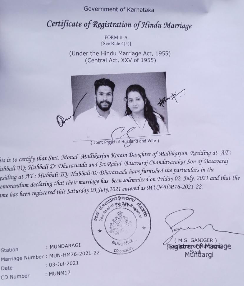 ಮೋನಲ್ ಮಲ್ಲಿಕಾರ್ಜುನ ಕೊರವಿ ತಾನು ಮದುವೆ ಮಾಡಿಕೊಂಡ ರಾಹುಲ ಬಸವರಾಜ ಚಂದಾವರಕರ ಎಂಬುವವರ ಜೊತೆ ಪೊಲೀಸ್ ಕಮೀಷನರ್ ಕಚೇರಿಗೆ ಬಂದು ರಕ್ಷಣೆ ಕೋರುತ್ತಿದ್ದಾರೆ.