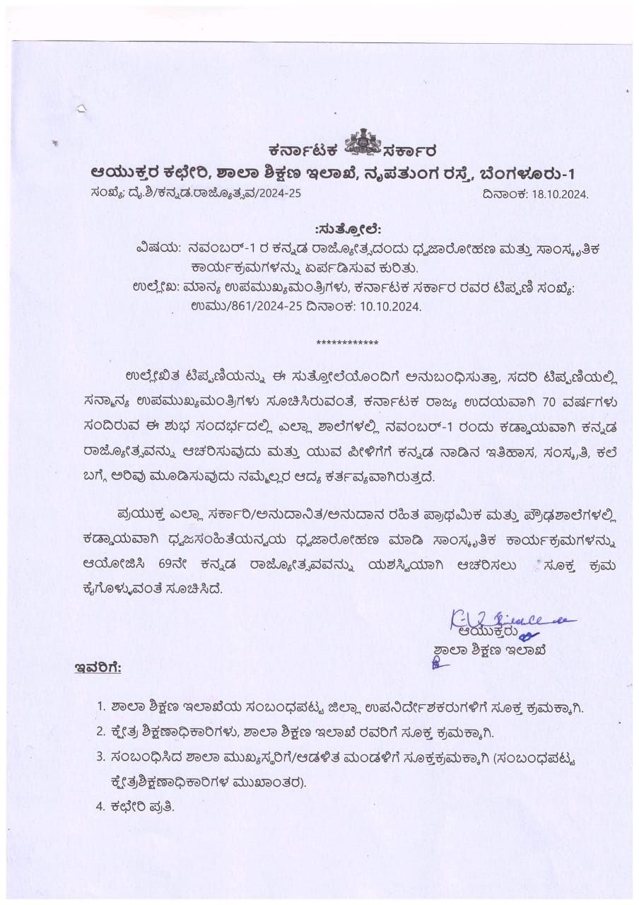ಶಾಲೆಗಳಲ್ಲಿ ರಾಷ್ಟ್ರಧ್ವಜವನ್ನ ಹಾರಿಸಿ, ಕನ್ನಡಾಂಬೆಯ ಭಾವಚಿತ್ರಕ್ಕೆ ಪೂಜೆಯನ್ನ ಮಾಡಬೇಕು. ನಂತರ ಸಾಂಸ್ಕೃತಿಕ ಕಾರ್ಯಕ್ರಮಗಳನ್ನು ನಡೆಸಬೇಕೆಂದು ನಿಖರವಾಗಿ ಕರ್ನಾಟಕವಾಯ್ಸ್. ಕಾಂಗೆ ಮಾಹಿತಿ ನೀಡಿದ್ದಾರೆ.