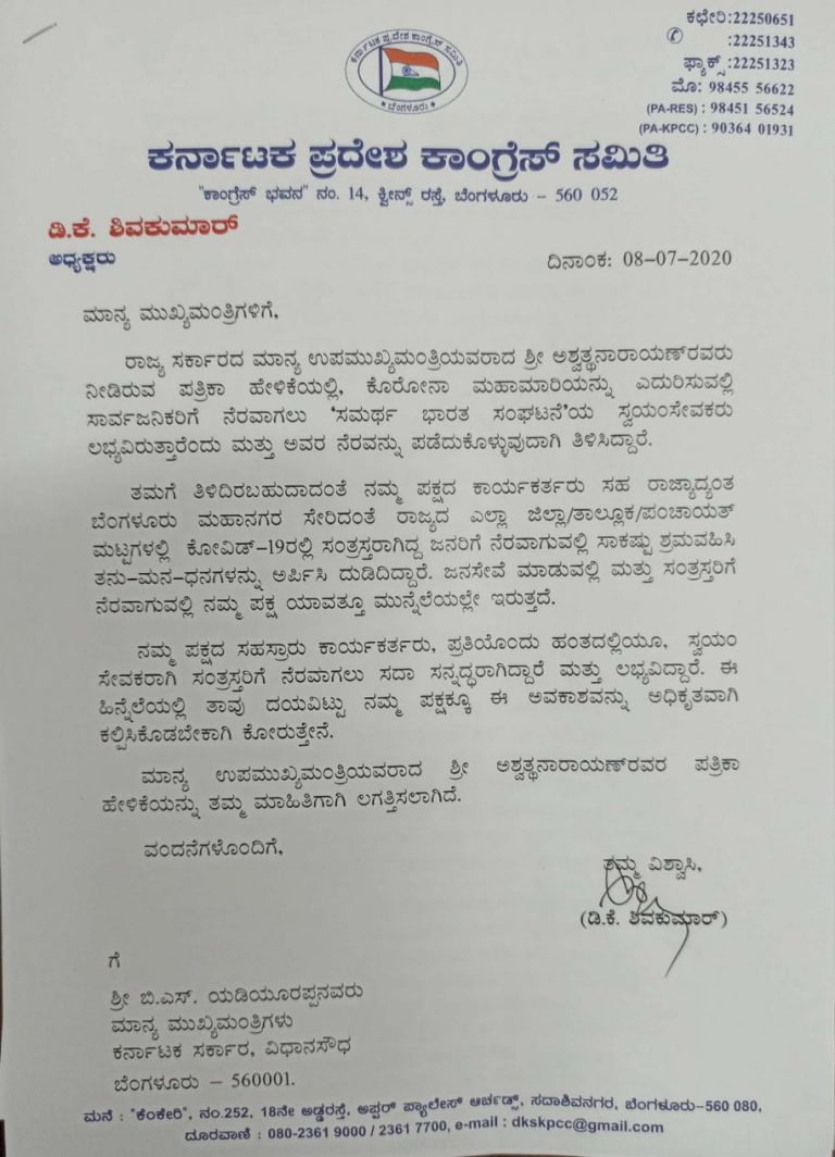 ಬೆಂಗಳೂರು: ಕೊರೋನಾ ಮಹಾಮಾರಿ ಎದುರಿಸುವಲ್ಲಿ ಸಾರ್ವಜನಿಕರಿಗೆ ನೆರವಾಗಲು ಕಾಂಗ್ರೆಸ್ ಕಾರ್ಯಕರ್ತರಿಗೂ ಅವಕಾಶ ನೀಡಿ ಎಂದು ಮುಖ್ಯಮಂತ್ರಿ ಯಡಿಯೂರಪ್ಪ ಅವರಿಗೆ ಆಗ್ರಹಿಸಿ ಕೆಪಿಸಿಸಿ ಅಧ್ಯಕ್ಷ ಡಿ.ಕೆ ಶಿವಕುಮಾರ್ ಪತ್ರ...