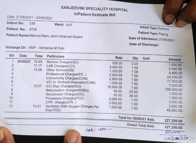 ಮೇ 27 ರಂದು ಆಸ್ಪತ್ರೆಗೆ ದಾಖಲಾಗಿದ್ದ ನಸೀಮಾಭಾನು ಜಮಿಲ್ ಅಹ್ಮದ ಶೇಖ, ಎನ್ನುವವರು ಗುರುವಾರ ಚಿಕಿತ್ಸೆ ಫಲಿಸದೆ ಸಾವಿಗೀಡಾಗಿದ್ದಾರೆ. ಆದರೆ, ಅಷ್ಟರಲ್ಲಿಯೇ 227250 ರೂಪಾಯಿ ಬಿಲ್ ಆಗಿದೆ. ಮೊದಲು ಕೊಟ್ಟಿದ್ದ 80 ಸಾವಿರ ರೂಪಾಯಿ ಮೈನಸ್ ಮಾಡಿದ್ರೂ, 147250 ರೂಪಾಯಿ ಕೊಟ್ಟರೇ ಮಾತ್ರ ಶವವನ್ನ ಕೊಡುವುದಾಗಿ ಮೃತಳ ಕುಟುಂಬದವರಿಗೆ ಆಸ್ಪತ್ರೆಯವರು ಹೇಳಿದರಂತೆ.