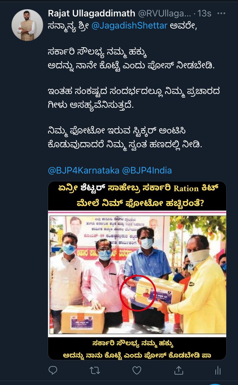 ಈ ಬಗ್ಗೆ ಟ್ವೀಟ್ ನಲ್ಲಿ ಛೇಡಿಸಿರುವ ರಜತ ಉಳ್ಳಾಗಡ್ಡಿಮಠ, ನಿಮ್ಮ ಪೋಟೊ ಹಚ್ಚಿ ಕೊಡುವುದಾದರೇ ನಿಮ್ಮ ಸ್ವಂತ ಹಣದಲ್ಲಿ ನೀಡಿ ಎಂದಿದ್ದಾರೆ. ಸಂಕಷ್ಟದ ಸಮಯದಲ್ಲೂ ಪೋಸ್ ಕೊಡುವುದು ಸರಿಯಲ್ಲವೆಂದಿದ್ದಾರೆ.