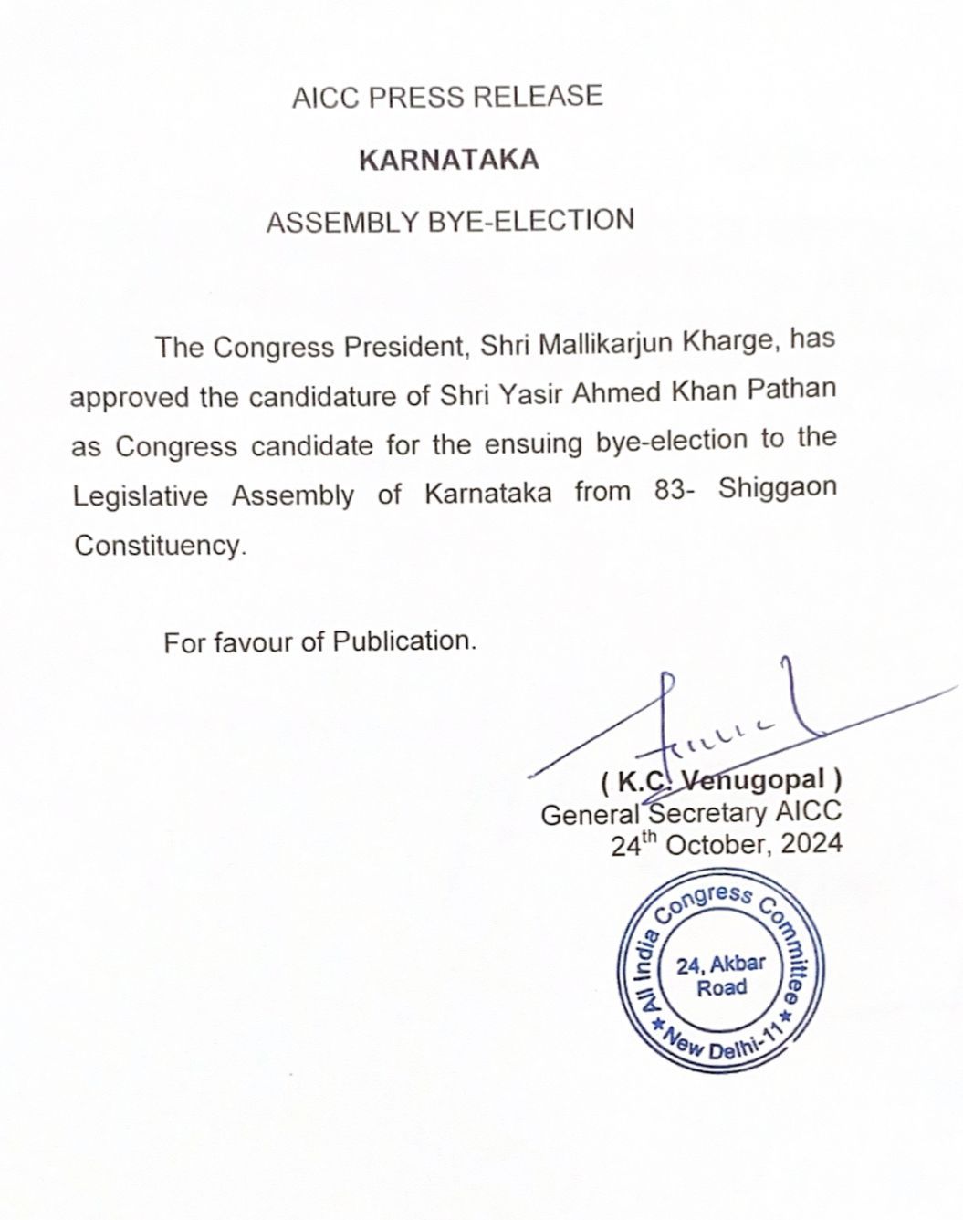 ನವದೆಹಲಿ: ಶಿಗ್ಗಾಂವ ಉಪಚುನಾವಣೆಯ ಕಾಂಗ್ರೆಸ್ ಅಭ್ಯರ್ಥಿಯನ್ನಾಗಿ ಯಾಸೀರಖಾನ್ ಪಠಾಣ ಅವರನ್ನ ಘೋಷಣೆ ಮಾಡಿದೆ.