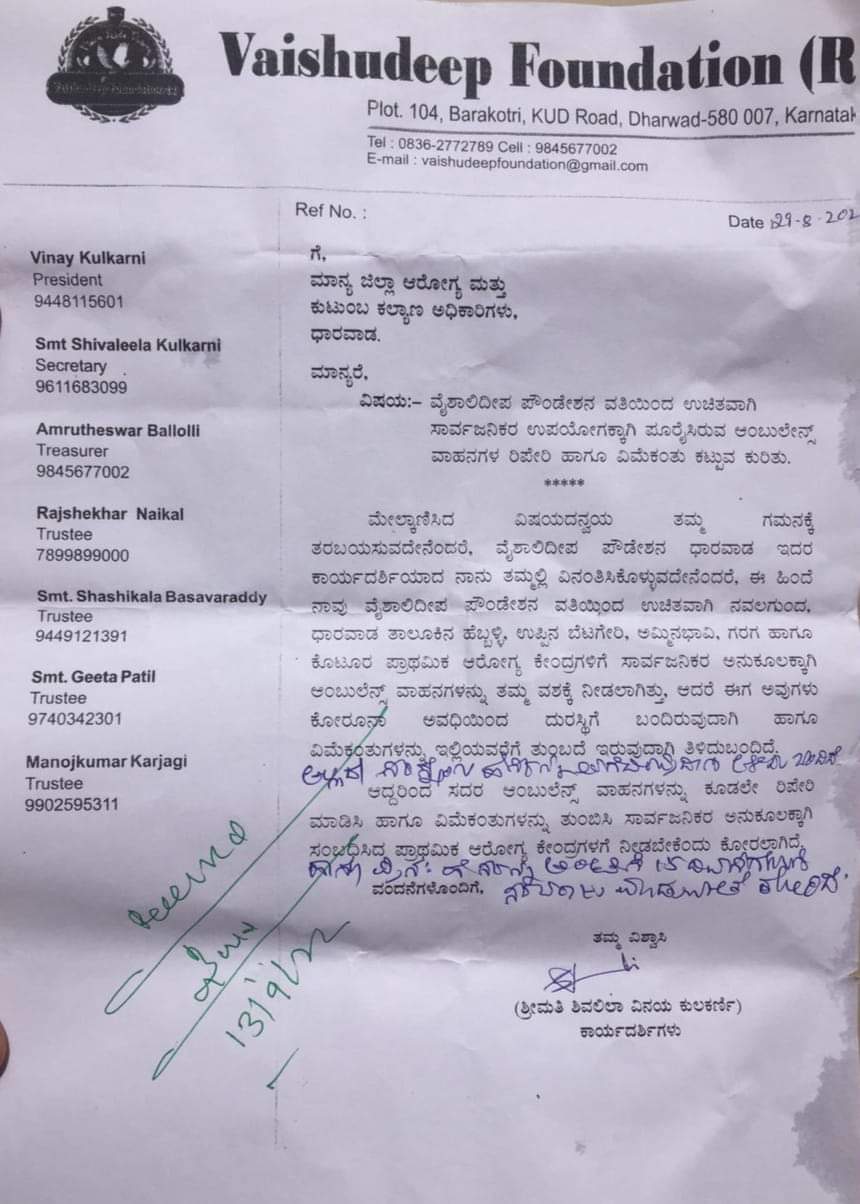 ವೈಶುದೀಪ ಫೌಂಡೇಶನ್ ನೀಡಿದ ಅಂಬ್ಯುಲೆನ್ಸ್ ಮರೆತ ಜಿಲ್ಲಾಡಳಿತ: ಎಚ್ಚರಿಸಿದ ಶಿವಲೀಲಾ ಕುಲಕರ್ಣಿ…!!